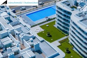• pomiędzy budynkami znajduje się przestrzeń rekreacyjna z otwartym basenem, tereny zielone z ławeczkami i strefami relaksu.